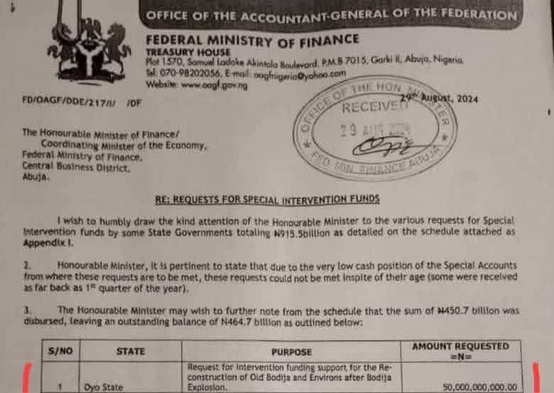 · The Claim: Oyo State received a ₦50 billion special intervention fund from President Tinubu for the Ibadan explosion.